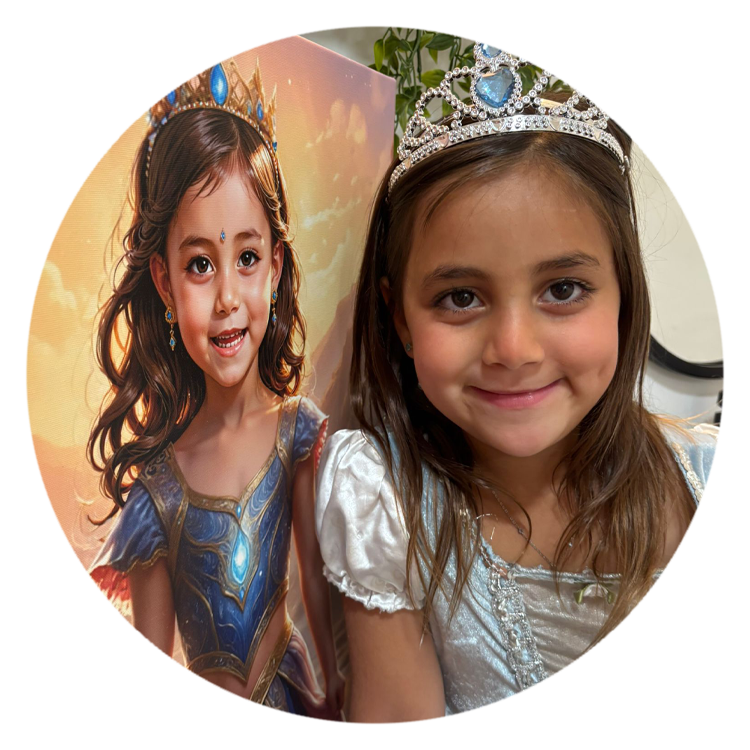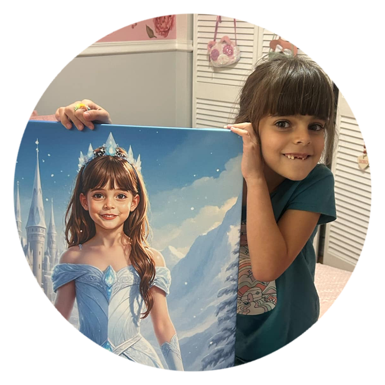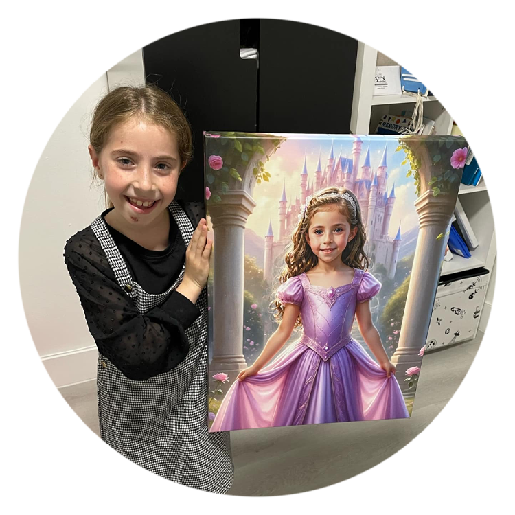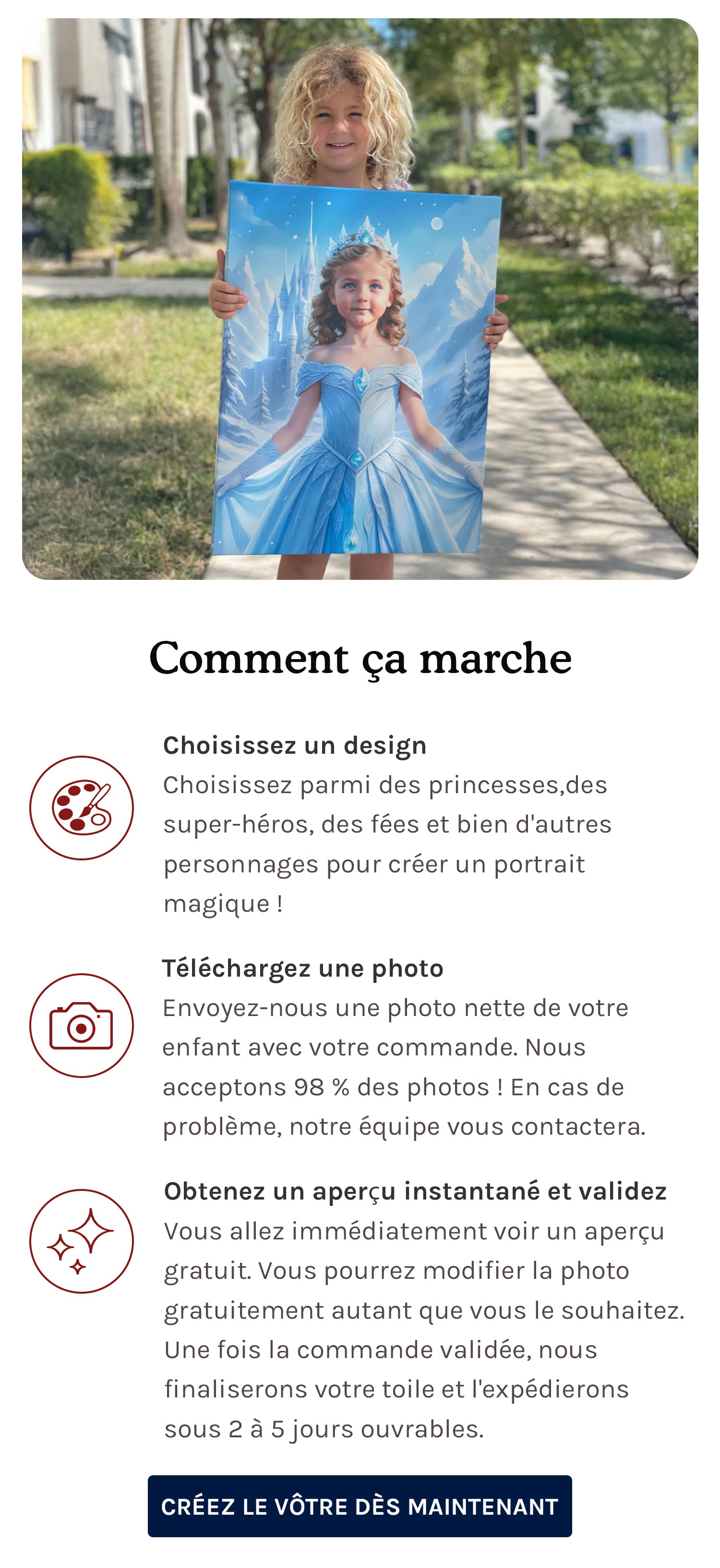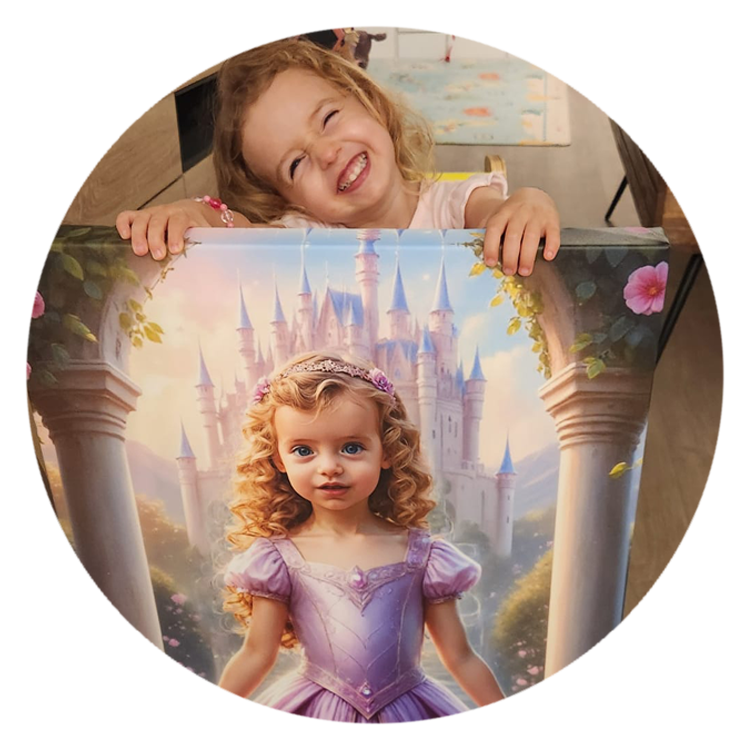 « Ma fille n’arrête pas de sourire devant son portrait de princesse. En plus, la livraison a été super rapide ! » — Sophie L., Lyon