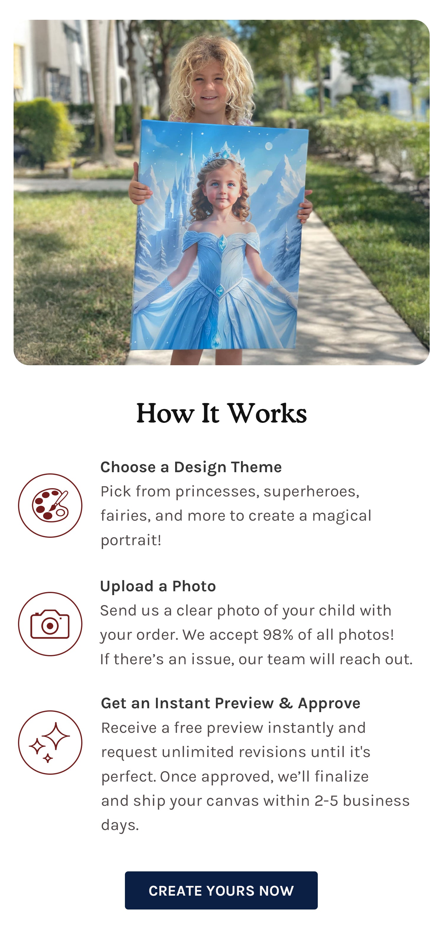 “My daughter can’t stop smiling at her princess picture. It arrived super fast, too!”— Amanda G., San Diego