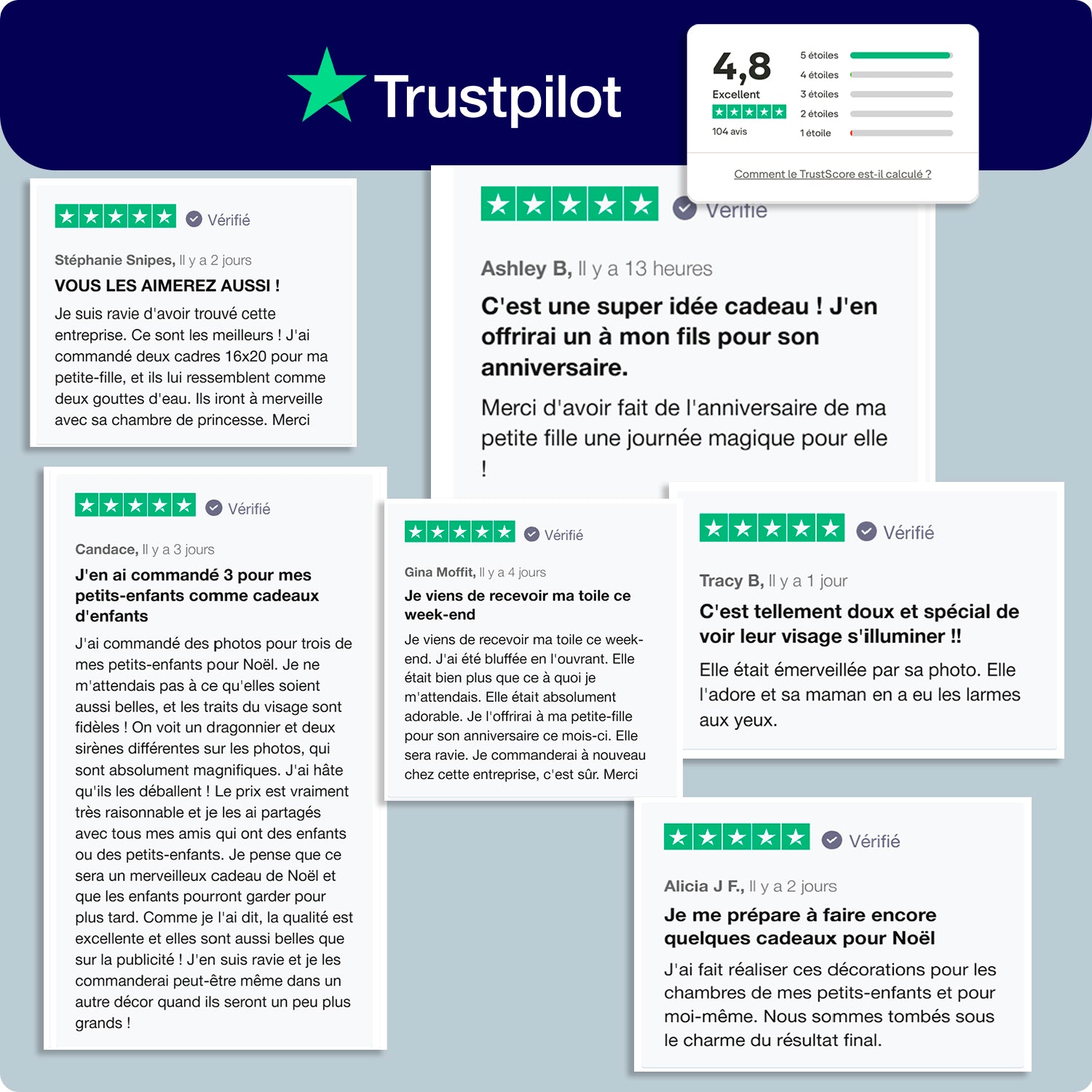 Nos portraits sont imprimés sur des toiles haute qualité, résistantes et élégantes, avec des couleurs éclatantes qui ne s’estompent jamais.