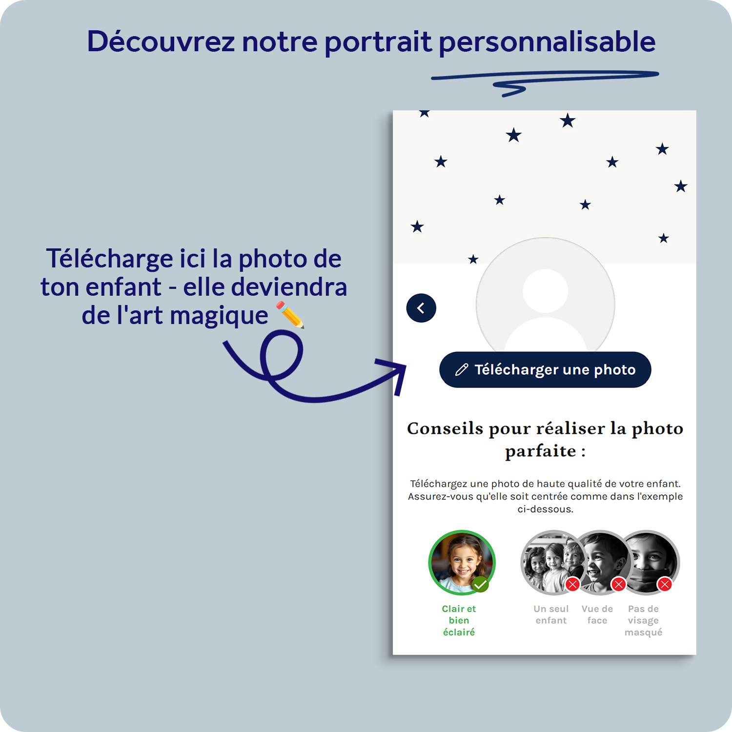 2️⃣ Téléchargez une photo de votre enfant : assurez-vous qu'elle soit nette et qu'elle montre bien son visage. 📷
