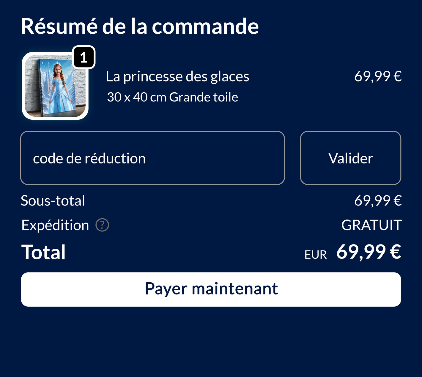 Una volta approvata l'anteprima, ti invieremo un file digitale ad alta qualità e inizieremo a realizzare la tua tela. Verrà stampata, impacchettata e spedita a casa tua in 3-6 giorni lavorativi. 📦